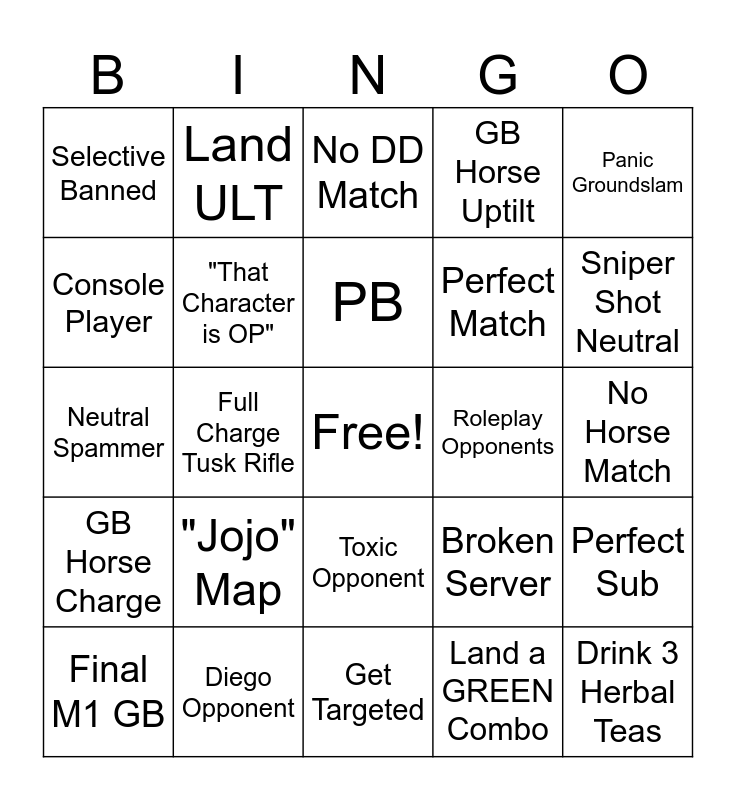 This bingo card has a free space and 24 words: "Jojo" Map, Diego Opponent, PB, Final M1 GB, Panic Groundslam, Selective Banned, Console Player, Land ULT, Roleplay Opponents, Toxic Opponent, Perfect Match, Neutral Spammer, Broken Server, Perfect Sub, "That Character is OP", Land a GREEN Combo, No Horse Match, No DD Match, Sniper Shot Neutral, Full Charge Tusk Rifle, Drink 3 Herbal Teas, GB Horse Charge, GB Horse Uptilt and Get Targeted.