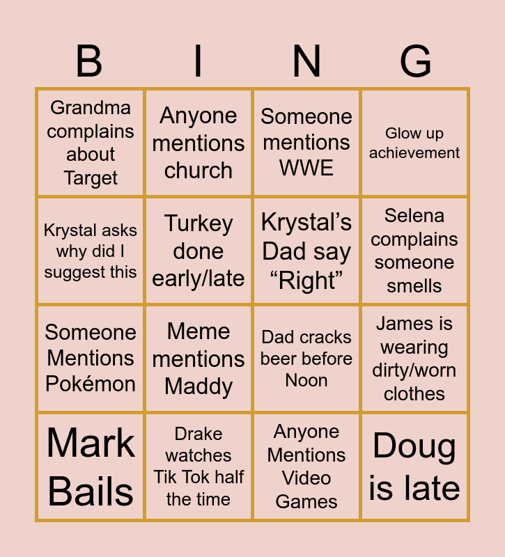 This bingo card has 16 words: Mark Bails, Drake watches Tik Tok half the time, Someone mentions WWE, Glow up achievement, Krystal asks why did I suggest this, Anyone mentions church, Dad cracks beer before Noon, James is wearing dirty/worn clothes, Grandma complains about Target, Turkey done early/late, Anyone Mentions Video Games, Selena complains someone smells, Someone Mentions Pokémon, Meme mentions Maddy, Krystal’s Dad say “Right” and Doug is late.