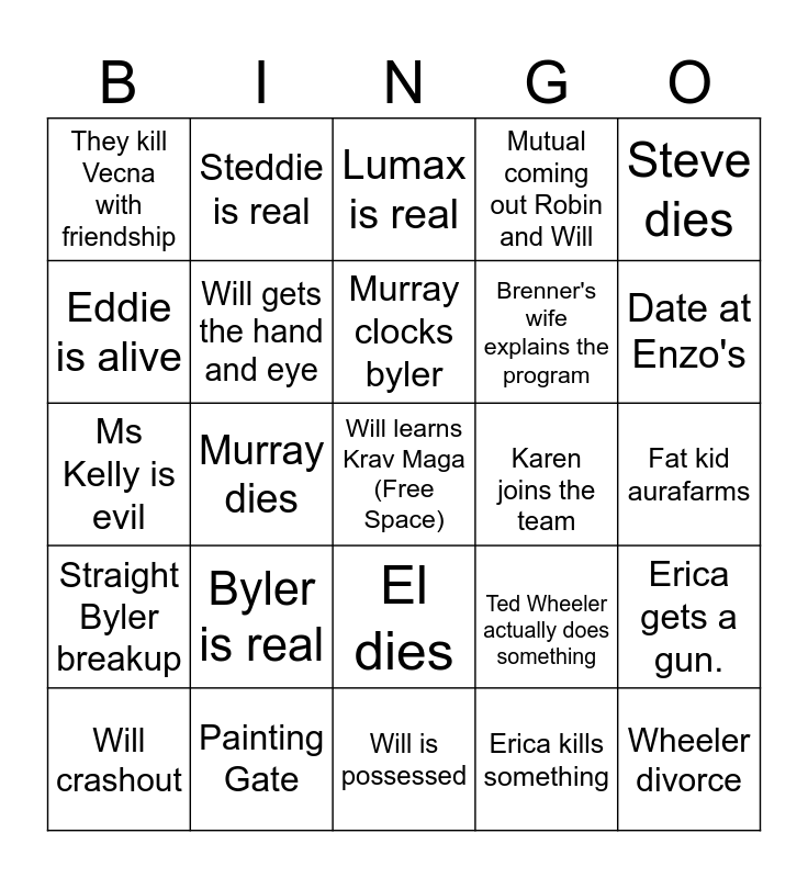 This bingo card has a free space and 24 words: Byler is real, Painting Gate, Murray clocks byler, Will crashout, Steve dies, They kill Vecna with friendship, Eddie is alive, Steddie is real, Karen joins the team, El dies, Brenner's wife explains the program, Ms Kelly is evil, Ted Wheeler actually does something, Erica gets a gun., Will gets the hand and eye, Erica kills something, Fat kid aurafarms, Lumax is real, Date at Enzo's, Murray dies, Wheeler divorce, Straight Byler breakup, Mutual coming out Robin and Will and Will is possessed.
