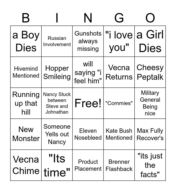 This bingo card has a free space and 24 words: Someone Yells out Nancy, "Its time", will saying "i feel him", Vecna Chime, a Girl Dies, a Boy Dies, Hivemind Mentioned, Russian Involvement, "Commies", Eleven Nosebleed, Vecna Returns, Running up that hill, Kate Bush Mentioned, Max Fully Recover's, Hopper Smileing, Brenner Flashback, Military General Being nice, Gunshots always missing, Cheesy Peptalk, Nancy Stuck between Steve and Johnathan, "its just the facts", New Monster, "i love you" and Product Placement.