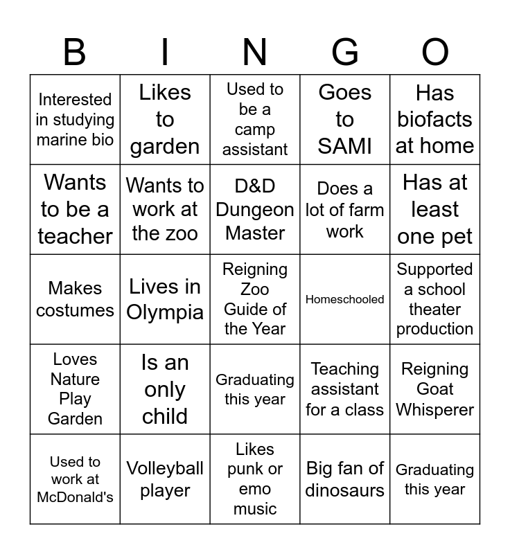 This bingo card has 26 words: Graduating this year, Big fan of dinosaurs, D&D Dungeon Master, Volleyball player, Has biofacts at home, Interested in studying marine bio, Wants to be a teacher, Likes to garden, Supported a school theater production, Teaching assistant for a class, Does a lot of farm work, Makes costumes, Reigning Goat Whisperer, Used to work at McDonald's, Lives in Olympia, Has seen Arcane on Netflix, Goes to SAMI, Loves Nature Play Garden, Used to be a camp assistant, Reigning Zoo Guide of the Year, Has at least one pet, Likes punk or emo music, Homeschooled, Is an only child, Wants to work at the zoo and Graduating this year.