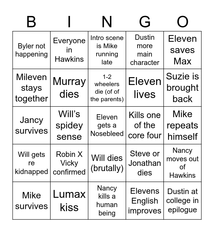 This bingo card has a free space and 24 words: Robin X Vicky confirmed, Lumax kiss, 1-2 wheelers die (of of the parents), Mike survives, Eleven saves Max, Byler not happening, Mileven stays together, Everyone in Hawkins, Kills one of the core four, Will dies (brutally), Eleven lives, Jancy survives, Steve or Jonathan dies, Nancy moves out of Hawkins, Murray dies, Elevens English improves, Mike repeats himself, Intro scene is Mike running late, Suzie is brought back, Will’s spidey sense, Dustin at college in epilogue, Will gets re kidnapped, Dustin more main character and Nancy kills a human being.