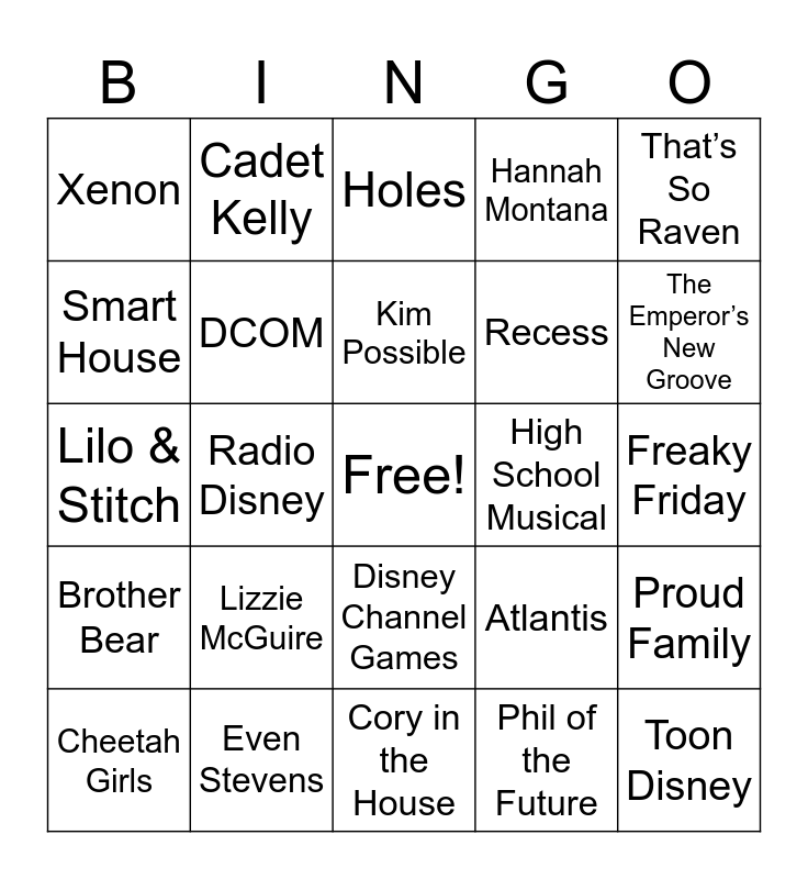 This bingo card has a free space and 24 words: Lizzie McGuire, Even Stevens, Kim Possible, Cheetah Girls, That’s So Raven, Xenon, Smart House, Cadet Kelly, High School Musical, Disney Channel Games, Recess, Lilo & Stitch, Atlantis, Proud Family, DCOM, Phil of the Future, Freaky Friday, Holes, The Emperor’s New Groove, Radio Disney, Toon Disney, Brother Bear, Hannah Montana and Cory in the House.