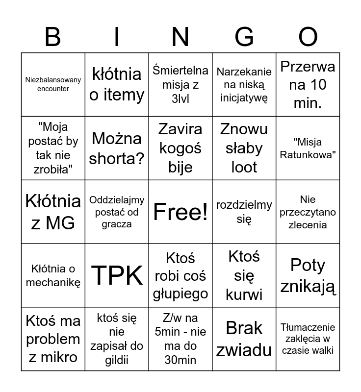 This bingo card has a free space and 24 words: TPK, ktoś się nie zapisał do gildii, Zavira kogoś bije, Ktoś ma problem z mikro, Przerwa na 10 min., Niezbalansowany encounter, "Moja postać by tak nie zrobiła", kłótnia o itemy, rozdzielmy się, Ktoś robi coś głupiego, Znowu słaby loot, Kłótnia z MG, Ktoś się kurwi, Poty znikają, Można shorta?, Brak zwiadu, Nie przeczytano zlecenia, Śmiertelna misja z 3lvl, "Misja Ratunkowa", Oddzielajmy postać od gracza, Tłumaczenie zaklęcia w czasie walki, Kłótnia o mechanikę, Narzekanie na niską inicjatywę and Z/w na 5min - nie ma do 30min.