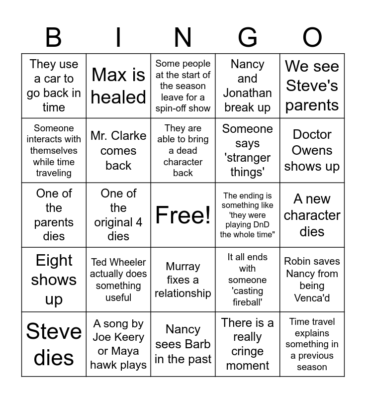 This bingo card has a free space and 24 words: Ted Wheeler actually does something useful, A song by Joe Keery or Maya hawk plays, They are able to bring a dead character back, Steve dies, We see Steve's parents, They use a car to go back in time, Someone interacts with themselves while time traveling, Max is healed, The ending is something like 'they were playing DnD the whole time", Murray fixes a relationship, Someone says 'stranger things', One of the parents dies, It all ends with someone 'casting fireball', Robin saves Nancy from being Venca'd, Mr. Clarke comes back, There is a really cringe moment, A new character dies, Some people at the start of the season leave for a spin-off show, Doctor Owens shows up, One of the original 4 dies, Time travel explains something in a previous season, Eight shows up, Nancy and Jonathan break up and Nancy sees Barb in the past.