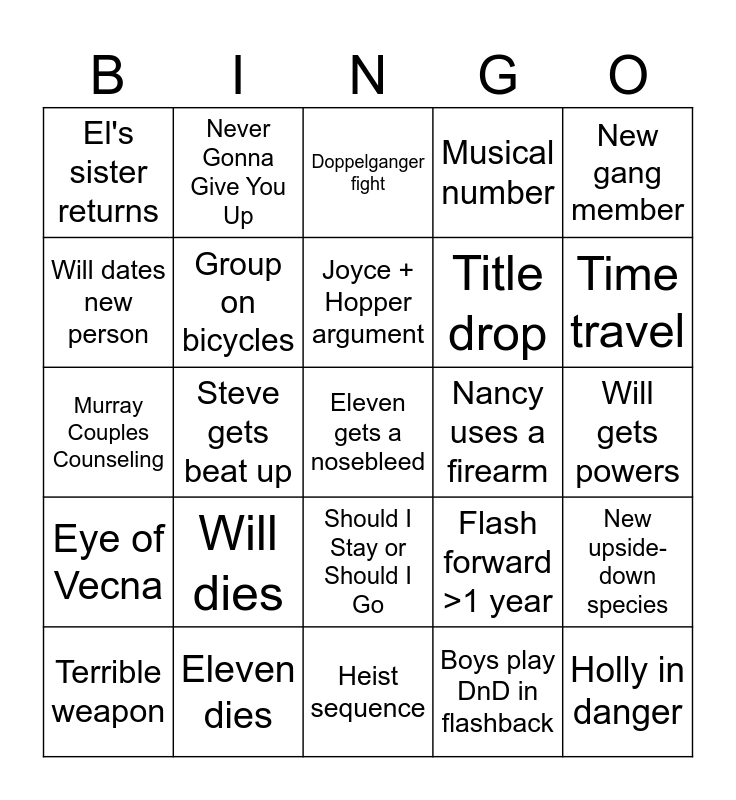 This bingo card has a free space and 24 words: Will dies, Eleven dies, Joyce + Hopper argument, Terrible weapon, New gang member, El's sister returns, Will dates new person, Never Gonna Give You Up, Nancy uses a firearm, Should I Stay or Should I Go, Title drop, Murray Couples Counseling, Flash forward >1 year, New upside-down species, Group on bicycles, Boys play DnD in flashback, Will gets powers, Doppelganger fight, Time travel, Steve gets beat up, Holly in danger, Eye of Vecna, Musical number and Heist sequence.