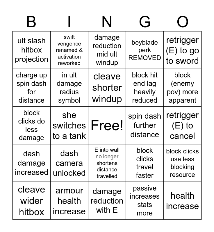This bingo card has a free space and 24 words: dash camera unlocked, armour health increase, cleave shorter windup, cleave wider hitbox, retrigger (E) to go to sword, ult slash hitbox projection, charge up spin dash for distance, swift vengence renamed & activation reworked, spin dash further distance, E into wall no longer shortens distance travelled, block hit end lag heavily reduced, block clicks do less damage, block clicks travel faster, block clicks use less blocking resource, in ult damage radius symbol, passive increases stats more, retrigger (E) to cancel, damage reduction mid ult windup, block (enemy pov) more apparent, she switches to a tank, health increase, dash damage increased, beyblade perk REMOVED and damage reduction with E.