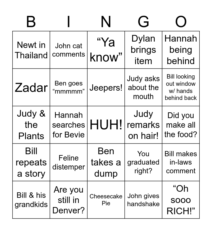 This bingo card has a free space and 24 words: Feline distemper, Are you still in Denver?, Jeepers!, Bill & his grandkids, Hannah being behind, Newt in Thailand, Zadar, John cat comments, Judy remarks on hair!, Ben takes a dump, Judy asks about the mouth, Judy & the Plants, You graduated right?, Bill makes in-laws comment, Ben goes “mmmmm”, John gives handshake, Did you make all the food?, “Ya know”, Bill looking out window w/ hands behind back, Hannah searches for Bevie, “Oh sooo RICH!”, Bill repeats a story, Dylan brings item and Cheesecake Pie.