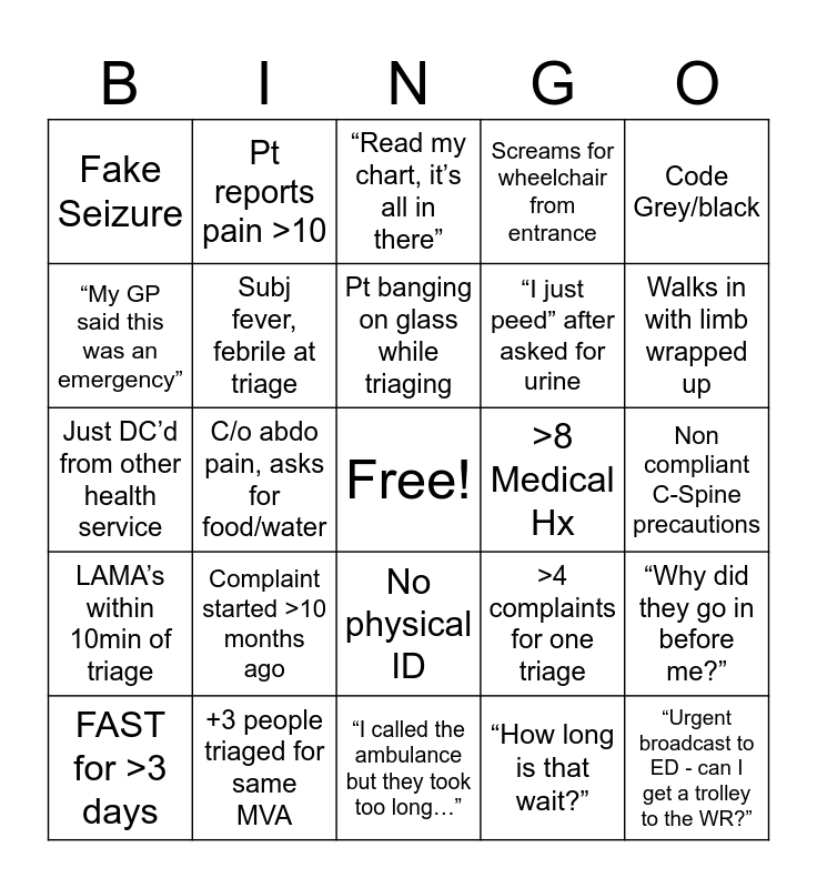 This bingo card has a free space and 24 words: Complaint started >10 months ago, +3 people triaged for same MVA, Pt banging on glass while triaging, FAST for >3 days, Code Grey/black, Fake Seizure, “My GP said this was an emergency”, Pt reports pain >10, >8 Medical Hx, No physical ID, “I just peed” after asked for urine, Just DC’d from other health service, >4 complaints for one triage, “Why did they go in before me?”, Subj fever, febrile at triage, “How long is that wait?”, Non compliant C-Spine precautions, “Read my chart, it’s all in there”, Walks in with limb wrapped up, C/o abdo pain, asks for food/water, “Urgent broadcast to ED - can I get a trolley to the WR?”, LAMA’s within 10min of triage, Screams for wheelchair from entrance and “I called the ambulance but they took too long…”.