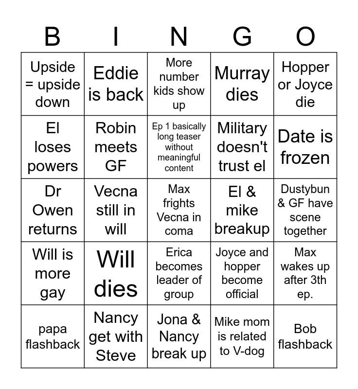 This bingo card has a free space and 24 words: Will dies, Nancy get with Steve, Ep 1 basically long teaser without meaningful content, papa flashback, Hopper or Joyce die, Upside = upside down, El loses powers, Eddie is back, El & mike breakup, Erica becomes leader of group, Military doesn't trust el, Dr Owen returns, Joyce and hopper become official, Max wakes up after 3th ep., Robin meets GF, Mike mom is related to V-dog, Dustybun & GF have scene together, More number kids show up, Date is frozen, Vecna still in will, Bob flashback, Will is more gay, Murray dies and Jona & Nancy break up.