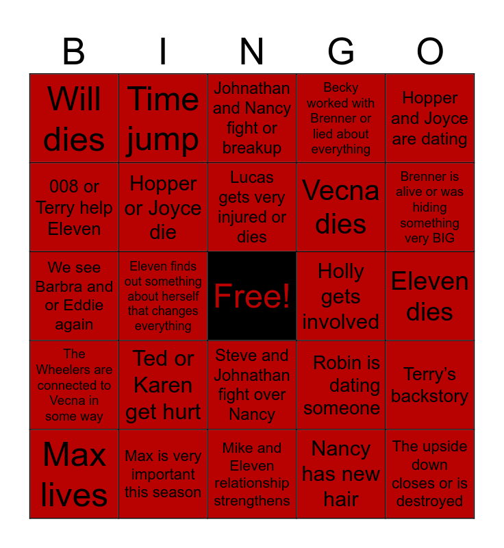 This bingo card has a free space and 24 words: Ted or Karen get hurt, Max is very important this season, Lucas gets very injured or dies, Max lives, Hopper and Joyce are dating, Will dies, 008 or Terry help Eleven, Time jump, Holly gets involved, Steve and Johnathan fight over Nancy, Vecna dies, We see Barbra and or Eddie again, Robin is dating someone, Terry’s backstory, Hopper or Joyce die, Nancy has new hair, Eleven dies, Johnathan and Nancy fight or breakup, Brenner is alive or was hiding something very BIG, Eleven finds out something about herself that changes everything, The upside down closes or is destroyed, The Wheelers are connected to Vecna in some way, Becky worked with Brenner or lied about everything and Mike and Eleven relationship strengthens.