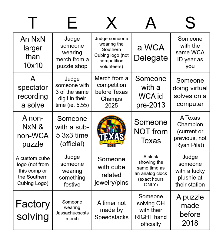 This bingo card has a free space and 24 words: Judge someone wearing something festive, Someone wearing Jassachuesests merch, Merch from a competition before Texas Champs 2025, Factory solving, Someone with the same WCA ID year as you, An NxN larger than 10x10, A spectator recording a solve, Judge someone wearing merch from a puzzle shop, Someone NOT from Texas, Someone with cube related jewelry/pins, Someone with a WCA id pre-2013, A non-NxN & non-WCA puzzle, A clock showing the same time as an analog clock (exact hours ONLY), Judge someone with a lucky plushie at their station, Judge someone with 3 of the same digit in their time (ie. 5.55), Someone solving OH with their RIGHT hand officially, A Texas Champion (current or previous, not Ryan Pilat), Judge someone wearing the Southern Cubing logo (not competition volunteers), Someone doing virtual solves on a computer, Someone with a sub-5 3x3 time (official), A puzzle made before 2018, A custom cube logo (not from this comp or the Southern Cubing Logo), a WCA Delegate and A timer not made by Speedstacks.