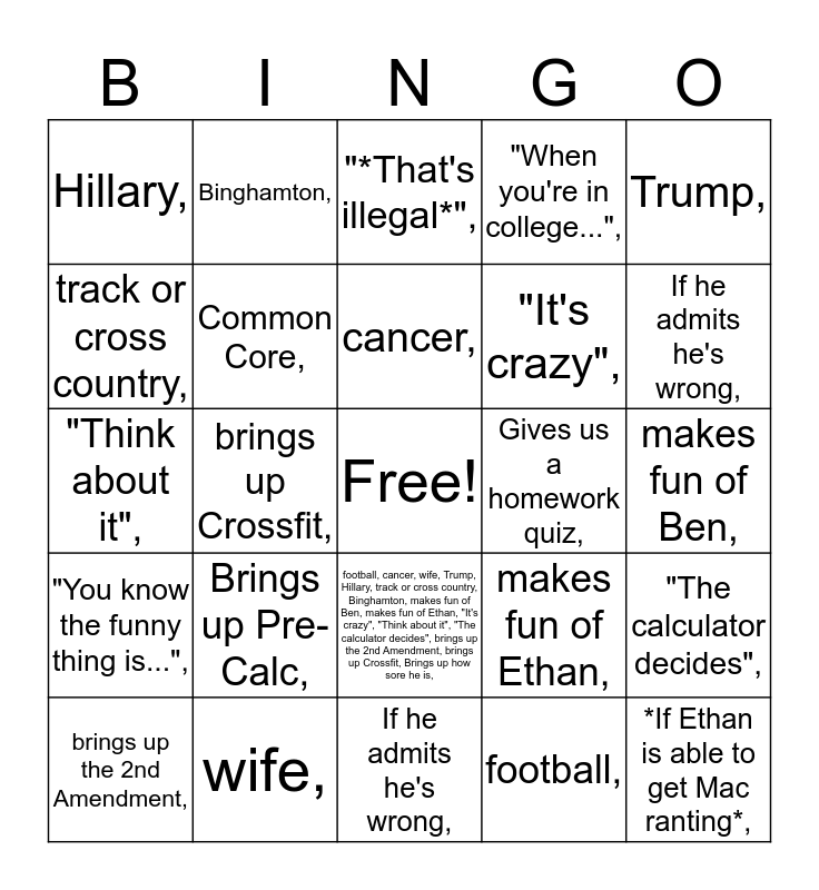 This bingo card has a free space and 26 words: football, cancer, wife, Trump, Hillary, track or cross country, Binghamton, makes fun of Ben, makes fun of Ethan, "It's crazy", "Think about it", "The calculator decides", brings up the 2nd Amendment, brings up Crossfit, Brings up how sore he is,, football,, cancer,, wife,, Trump,, Hillary,, track or cross country,, Binghamton,, makes fun of Ben,, makes fun of Ethan,, "It's crazy",, "Think about it",, "The calculator decides",, brings up the 2nd Amendment,, brings up Crossfit,, Brings up how sore he is,, "When you're in college...",, "You know the funny thing is...",, "*That's illegal*",, *If Ethan is able to get Mac ranting*,, If he admits he's wrong,, If he admits he's wrong,, Gives us a homework quiz,, Brings up Pre-Calc,, Common Core, and "Our education system",.