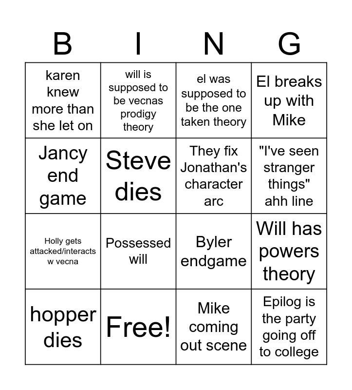 This bingo card has 16 words: Free!, Will has powers theory, el was supposed to be the one taken theory, karen knew more than she let on, Holly gets attacked/interacts w vecna, will is supposed to be vecnas prodigy theory, Byler endgame, Mike coming out scene, Jancy end game, Steve dies, hopper dies, El breaks up with Mike, Possessed will, "I've seen stranger things" ahh line, They fix Jonathan's character arc and Epilog is the party going off to college.