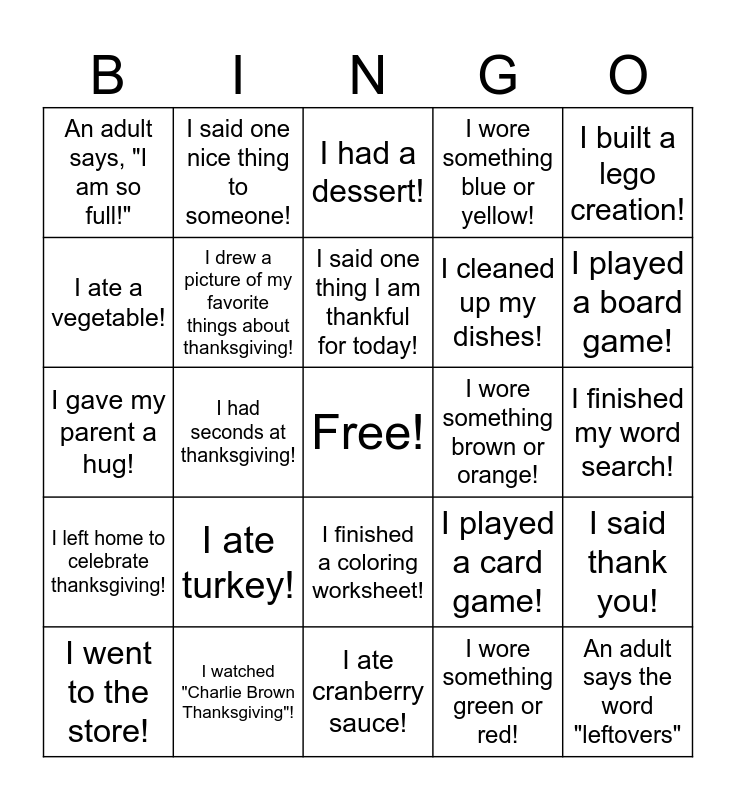 This bingo card has a free space and 24 words: I ate turkey!, I watched "Charlie Brown Thanksgiving"!, I said one thing I am thankful for today!, I went to the store!, I built a lego creation!, An adult says, "I am so full!", I ate a vegetable!, I said one nice thing to someone!, I wore something brown or orange!, I finished a coloring worksheet!, I cleaned up my dishes!, I gave my parent a hug!, I played a card game!, I said thank you!, I drew a picture of my favorite things about thanksgiving!, I wore something green or red!, I finished my word search!, I had a dessert!, I played a board game!, I had seconds at thanksgiving!, An adult says the word "leftovers", I left home to celebrate thanksgiving!, I wore something blue or yellow! and I ate cranberry sauce!.