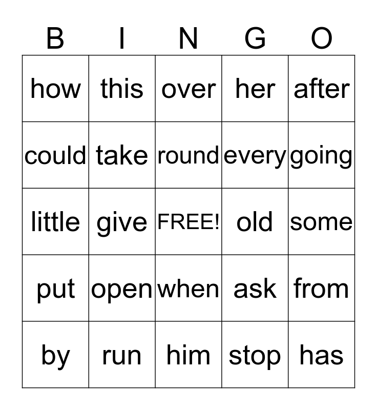This bingo card has a free space and 24 words: open, run, round, by, after, how, could, this, old, when, every, little, ask, from, take, stop, some, over, going, give, has, put, her and him.