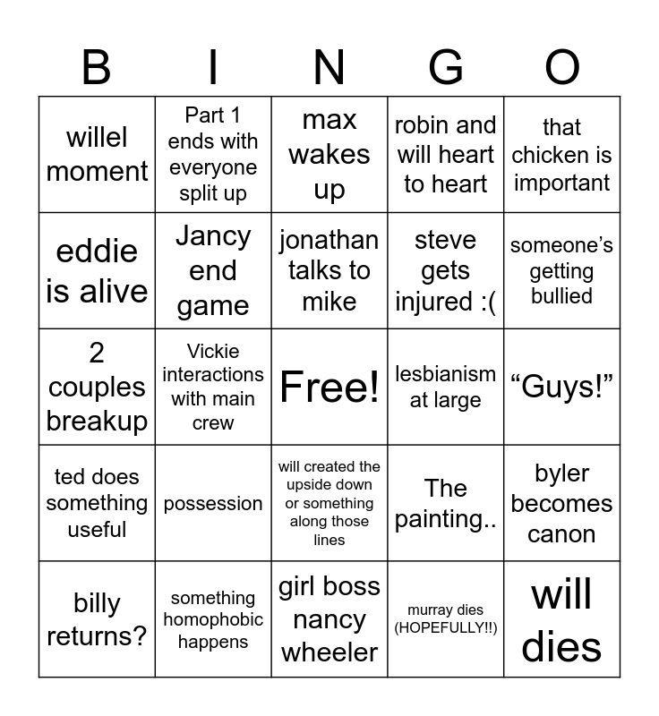 This bingo card has a free space and 24 words: possession, something homophobic happens, jonathan talks to mike, billy returns?, that chicken is important, willel moment, eddie is alive, Part 1 ends with everyone split up, lesbianism at large, will created the upside down or something along those lines, steve gets injured :(, 2 couples breakup, The painting.., byler becomes canon, Jancy end game, murray dies (HOPEFULLY!!), “Guys!”, max wakes up, someone’s getting bullied, Vickie interactions with main crew, will dies, ted does something useful, robin and will heart to heart and girl boss nancy wheeler.