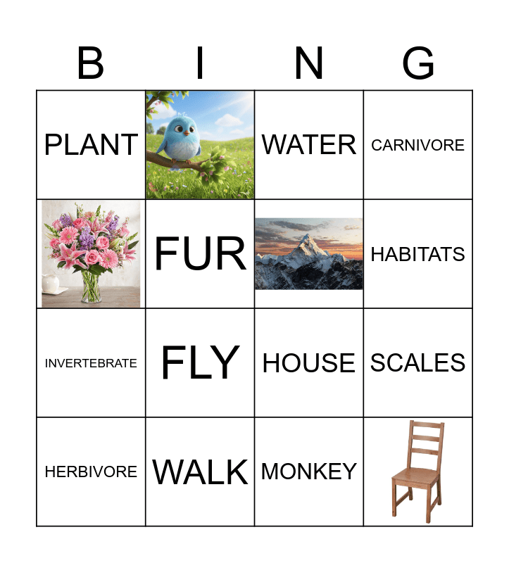 This bingo card has 9 images and 25 words: Free!, HABITATS, WATER, BUTTERFLY, LIVING BEINGS, WALK, FLY, OCEAN, HOUSE, FARM, FOREST, TREES, CHAIR, PLANT, MONKEY, DOG, HERBIVORE, CARNIVORE, VERTEBRATE, INVERTEBRATE, FUR, FEATHERS, SCALES, SAVANNA and GOLDILOCKS.