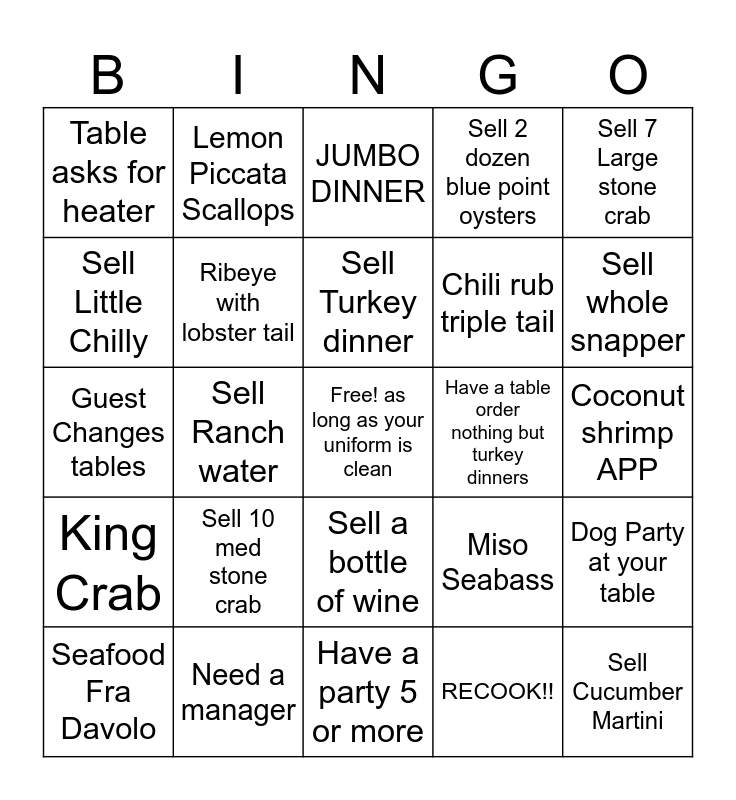 This bingo card has a free space and 24 words: Sell 10 med stone crab, Need a manager, Sell Turkey dinner, Seafood Fra Davolo, Sell 7 Large stone crab, Table asks for heater, Sell Little Chilly, Lemon Piccata Scallops, Have a table order nothing but turkey dinners, Sell a bottle of wine, Chili rub triple tail, Guest Changes tables, Miso Seabass, Dog Party at your table, Ribeye with lobster tail, RECOOK!!, Coconut shrimp APP, JUMBO DINNER, Sell whole snapper, Sell Ranch water, Sell Cucumber Martini, King Crab, Sell 2 dozen blue point oysters and Have a party 5 or more.