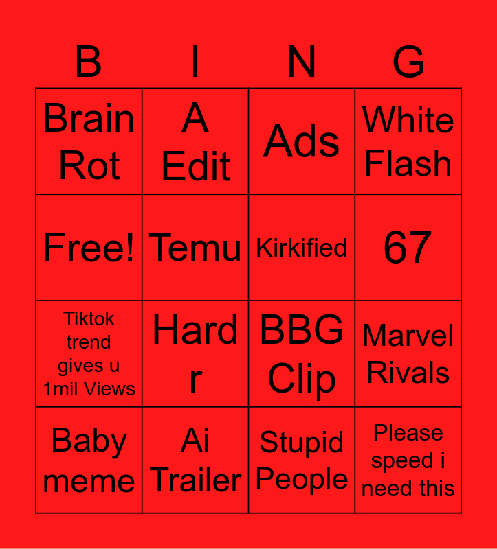 This bingo card has 16 words: Ai Trailer, Marvel Rivals, Ads, Brain Rot, Tiktok trend gives u 1mil Views, A Edit, BBG Clip, Stupid People, Free!, Temu, Baby meme, White Flash, Hard r, 67, Kirkified and Please speed i need this.