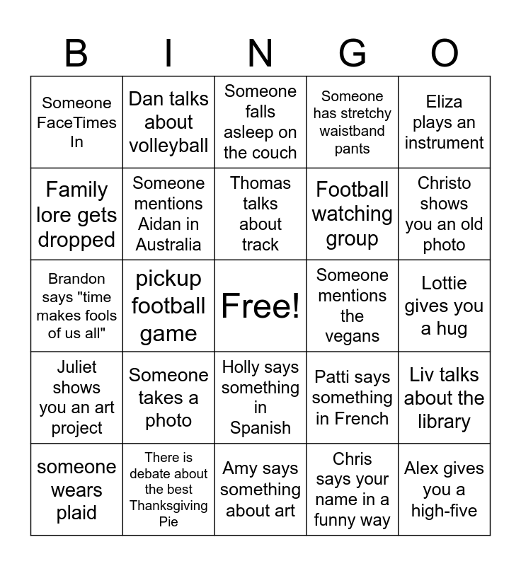 This bingo card has a free space and 29 words: someone wears plaid, someone wears a turtleneck, pickup football game, someone says "gobble gobble", Someone FaceTimes In, Someone falls asleep on the couch, Someone mentions Aidan in Australia, Someone takes a photo, Someone mentions the vegans, There is debate about the best Thanksgiving Pie, Lottie gives you a hug, Alex gives you a high-five, Amy says something about art, Chris says your name in a funny way, Christo shows you an old photo, Annette says "WOOOO", Holly says something in Spanish, Juliet shows you an art project, Eliza plays an instrument, Brandon says "time makes fools of us all", Patti says something in French, Michaela gives a food ETA, Football watching group, Family lore gets dropped, Someone has stretchy waistband pants, Dan talks about volleyball, Liv talks about the library, Thomas talks about track and Luke talks about Bob Dylan.