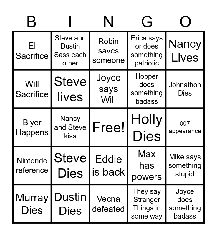 This bingo card has a free space and 24 words: Steve Dies, Dustin Dies, Joyce says Will, Murray Dies, Nancy Lives, El Sacrifice, Will Sacrifice, Steve and Dustin Sass each other, Holly Dies, Eddie is back, Hopper does something badass, Blyer Happens, Max has powers, Mike says something stupid, Steve lives, They say Stranger Things in some way, 007 appearance, Robin saves someone, Johnathon Dies, Nancy and Steve kiss, Joyce does something badass, Nintendo reference, Erica says or does something patriotic and Vecna defeated.