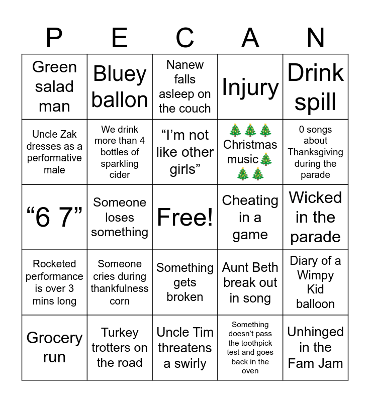 This bingo card has a free space and 44 words: Mav eats all or part of a drumstick, Unhinged in the Fam Jam, Kazoo falls asleep on the couch, Grocery run, Something gets burnt, Something doesn’t pass the toothpick test and goes back in the oven, Nanew falls asleep on the couch, Someone’s drink gets thrown away when they weren’t done with it, Drink spill, Turkey trotters on the road, Injury, Cheating in a game, Something gets broken, Someone cries during thankfulness corn, Nanew and Kazoo fall asleep at the SAME TIME, Uncle Tim threatens a swirly, “Does this belong to somebody?”, “6 7”, Kids ask for Shirley Temples, 0 songs about Thanksgiving during the parade, Bluey ballon, Pokémon balloon, Snoopy balloon, Green salad man, Sesame Street, Wicked in the parade, Chicago in the parade, The Great Gatsby in the parade, Aunt Beth break out in song, Rocketed performance is over 3 mins long, Rockettes come on before 9am, Diary of a Wimpy Kid balloon, Harlow wears patterned pants, Uncle Zak commentary watching a movie, Someone loses something, Pax says “✨slayyy✨”, Post-dinner board games, Dinner starts before 5pm, “I’m not like other girls”, Uncle Zak dresses as a performative male, 🎄🎄🎄Christmas music🎄🎄🎄, A legal ADULT mentions a dog with their thankfulness corn, We drink more than 4 bottles of sparkling cider and Kazoo gets out the fancy bottles for water.