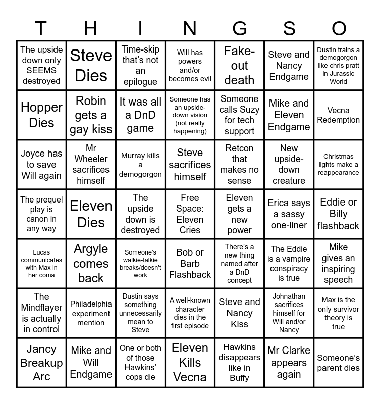 This bingo card has a free space and 48 words: Steve and Nancy Kiss, Mike and Eleven Endgame, Eleven Kills Vecna, Eleven Dies, Murray kills a demogorgon, Eddie or Billy flashback, Steve Dies, Mike and Will Endgame, Steve and Nancy Endgame, Bob or Barb Flashback, Dustin trains a demogorgon like chris pratt in Jurassic World, Will has powers and/or becomes evil, New upside-down creature, Retcon that makes no sense, The Mindflayer is actually in control, Erica says a sassy one-liner, Hopper Dies, Vecna Redemption, Johnathan sacrifices himself for Will and/or Nancy, Fake-out death, Someone calls Suzy for tech support, The upside down is destroyed, The upside down only SEEMS destroyed, Robin gets a gay kiss, Max is the only survivor theory is true, It was all a DnD game, Christmas lights make a reappearance, Jancy Breakup Arc, Steve sacrifices himself, Mr Wheeler sacrifices himself, Mr Clarke appears again, Eleven gets a new power, Mike gives an inspiring speech, Philadelphia experiment mention, The prequel play is canon in any way, There’s a new thing named after a DnD concept, The Eddie is a vampire conspiracy is true, Joyce has to save Will again, Someone’s walkie-talkie breaks/doesn’t work, Dustin says something unnecessarily mean to Steve, Lucas communicates with Max in her coma, Someone’s parent dies, Time-skip that’s not an epilogue, One or both of those Hawkins’ cops die, Someone has an upside-down vision (not really happening), A well-known character dies in the first episode, Argyle comes back and Hawkins disappears like in Buffy.