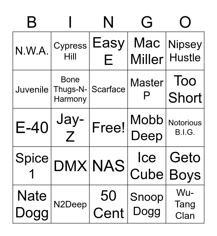 This bingo card has a free space and 31 words: 50 Cent, Tupac, Jay-Z, Kendrick Lamar, N.W.A., Easy E, Bone Thugs-N-Harmony, Ice Cube, Mobb Deep, Snoop Dogg, Notorious B.I.G., Wu-Tang Clan, Dr. Dre, Warren G, Too Short, The Game, Geto Boys, DMX, Spice 1, NAS, Nipsey Hustle, Capone-N-Noreaga, Nate Dogg, Cypress Hill, Master P, Juvenile, Mac Miller, E-40, N2Deep, Scarface and Three 6 Mafia.