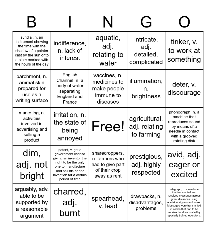 This bingo card has a free space and 60 words: airborne, adj. in flight, charred, adj. burnt, diaphragm, n. a thin disk or piece of material that vibrates when producing or receiving sound waves, dim, adj. not bright, drawbacks, n. disadvantages, problems, ecosystems, n. systems formed by the interaction of communities of organisms with their environments, English Channel, n. a body of water separating England and France, evaporate, v. change from a liquid state into a vapor, illumination, n. brightness, inspire, v. give rise to, lead to, intricate, adj. detailed, complicated, isolated, adj. far away from other places, buildings, or people; remote, parchment, n. animal skin prepared for use as a writing surface, pendulum, n. a weighted, swinging lever that regulates the speed of a clock, potential, n. qualities or abilities that may be developed and lead to future success, sundial, n. an instrument showing the time with the shadow of a pointer cast by the sun onto a plate marked with the hours of the day, telegraph, n. a machine that transmitted and received messages across great distances using electrical signals and wires. Messages were transmitted in codes that had to be received and translated by specially trained operators., tinker, v. to work at something, transmitter, n. a set of equipment used to generate and transmit electromagnetic waves carrying messages or signals, especially those of radio or television, vaccines, n. medicines to make people immune to diseases, agricultural, adj. relating to farming, aquatic, adj. relating to water, arguably, adv. able to be supported by a reasonable argument, avid, adj. eager or excited, botanist, n. a scientist who studies plants, botany, n. the scientific study of plants, crop rotation, n. yearly switching of which crops are grown on a piece of land, deliberately, adv. on purpose, deter, v. discourage, fertile, adj. capable of producing healthy plants, financiers, n. people who give inventors money to develop and sell their products, in return for a portion of the profits, frequency, n. the rate at which radio signals are transmitted, greasy spoons, n. slang for cheap and unsanitary restaurants, humble, adj. not significant; modest, indifference, n. lack of interest, inventory, n. a complete list, irk, v. bother, irritate, irritation, n. the state of being annoyed, malfunctioning, adj. not working properly, marketing, n. activities involved in advertising and selling a product, optimistic, adj. expecting a favorable outcome, patent, v. get a government license giving an inventor the right to be the only one to manufacture and sell his or her invention for a certain period of time, phonograph, n. a machine that reproduces sound by means of a needle in contact with a grooved rotating disk, player piano, n. a piano fitted with an apparatus enabling it to be played automatically, prestigious, adj. highly respected, producers, n. people who supervise a television production, profit, n. (often financial) gain, rehabilitation, v. recovery, self-sufficient, adj. able to take care of oneself, sharecroppers, n. farmers who had to give part of their crop away as rent, spearhead, v. lead, synchronized, adj. occurring at the same time, take root, v. begin, telegraph, n. a machine that transmitted and received messages across great distances using electrical signals and wires. Messages were transmitted in codes that had to be received and translated by specially trained operators, producers, n. people who supervise a television production, practical, adj. useful, quelle guigne!, French for “what bad luck!”, quelle merveille!, French for “how marvelous!”, stylus, n. a pointed, pen-shaped instrument used to make an imprint on a surface and très magnifique, adj. French for “really wonderful”.