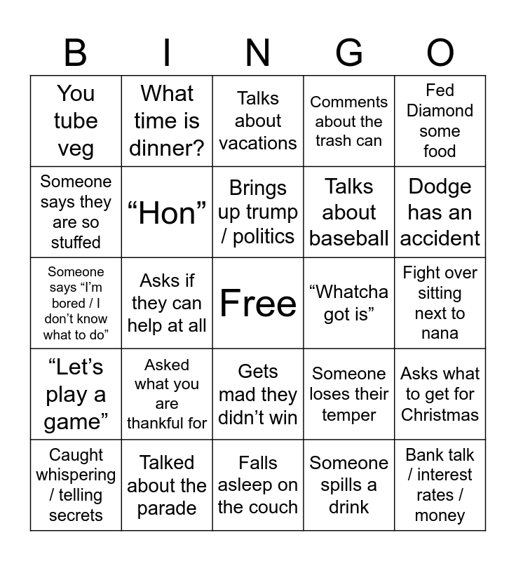 This bingo card has a free space and 24 words: Asked what you are thankful for, Talked about the parade, Brings up trump / politics, Caught whispering / telling secrets, Fed Diamond some food, You tube veg, Someone says they are so stuffed, What time is dinner?, “Whatcha got is”, Gets mad they didn’t win, Talks about baseball, Someone says “I’m bored / I don’t know what to do”, Someone loses their temper, Asks what to get for Christmas, “Hon”, Someone spills a drink, Fight over sitting next to nana, Talks about vacations, Dodge has an accident, Asks if they can help at all, Bank talk / interest rates / money, “Let’s play a game”, Comments about the trash can and Falls asleep on the couch.