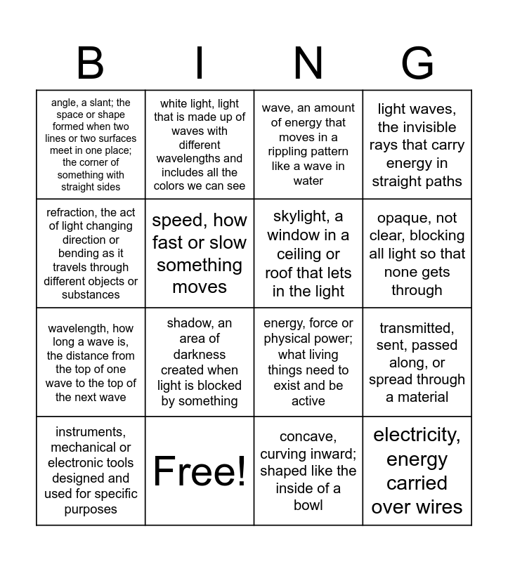 This bingo card has 27 words: source, a starting place, where something comes from, energy, a supply of power, wavelength, how long a wave is, the distance from the top of one wave to the top of the next wave, vacuum, emptiness, speed, how fast or slow something moves, wave, an amount of energy that moves in a rippling pattern like a wave in water, white light, light that is made up of waves with different wavelengths and includes all the colors we can see, electricity, energy carried over wires, Free!, illuminates, provides light; brightens; makes something clearer or easier to see or understand, energy, force or physical power; what living things need to exist and be active, light waves, the invisible rays that carry energy in straight paths, particles, tiny or very small bits of something, rays, lines of light that travel in a straight path from a bright object, shadow, an area of darkness created when light is blocked by something, transparent, clear, see-through so that light gets through, skylight, a window in a ceiling or roof that lets in the light, opaque, not clear, blocking all light so that none gets through, project, to cause light to appear on a surface, angle, a slant; the space or shape formed when two lines or two surfaces meet in one place; the corner of something with straight sides, concave, curving inward; shaped like the inside of a bowl, convex, rounded or curving outward; shaped like the outside of a bowl, transmitted, sent, passed along, or spread through a material, instruments, mechanical or electronic tools designed and used for specific purposes, lens, a clear piece of curved glass or plastic that is used to make things look clearer, larger, or smaller, refraction, the act of light changing direction or bending as it travels through different objects or substances and translucent, describes an object that allows some light to pass through, so that you are able to see the form of an object but not a clear image..