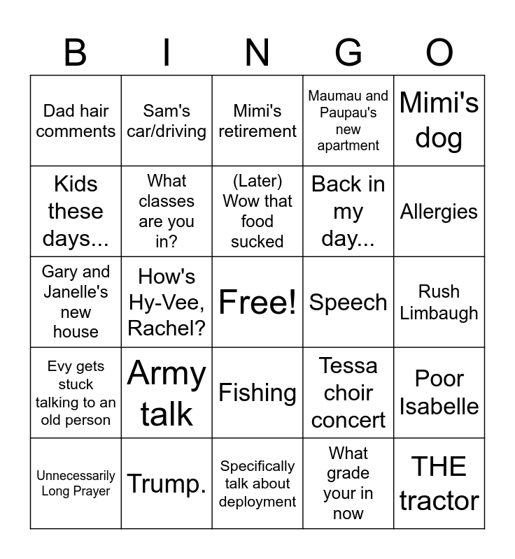 This bingo card has a free space and 29 words: Unnecessarily Long Prayer, Weird food choice, How's Hy-Vee, Rachel?, Quit running!!, Dad hair comments, Mimi's retirement, What classes are you in?, Army talk, Speech, Trump., Rush Limbaugh, THE tractor, Specifically talk about deployment, What grade your in now, Allergies, How's Hy-Vee, Sam?, Fishing, Evy gets stuck talking to an old person, Mimi's dog, Gary and Janelle's new house, Tessa choir concert, Sour cream and raisin pie, Back in my day..., Kids these days..., Maumau and Paupau's new apartment, Sam's car/driving, Poor Isabelle, (Later) Wow that food sucked and (Later) THAT WAS WAY TOO LOUD.