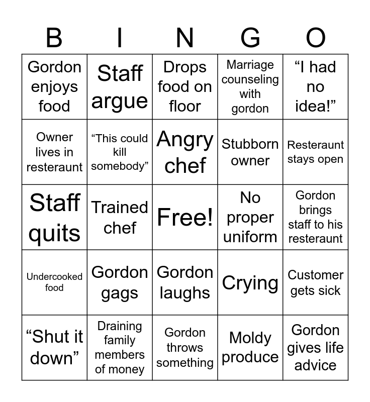 This bingo card has a free space and 34 words: Gordon finds bug, Moldy produce, Slimy meat, Warmer fridge, Undercooked food, “This could kill somebody”, “I had no idea!”, “Shut it down”, Staff argue, Something’s broken, Angry chef, Drops food on floor, Customer returns food, Restaurant closes, No proper uniform, Resteraunt stays open, Draining family members of money, Staff quits, Gordon gags, Crying, Gordon laughs, Gordon spits food out, Gordon enjoys food, Gordon brings staff to his resteraunt, Gordon throws something, Gordon gives life advice, Marriage counseling with gordon, Staff is owners kid, Stubborn owner, Owner lives in resteraunt, Untrained chef, Trained chef, Customer gets sick and Hair in food.
