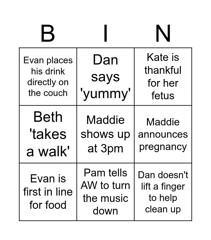 This bingo card has a free space and 8 words: Maddie announces pregnancy, Kate is thankful for her fetus, Dan says 'yummy', Evan is first in line for food, Evan places his drink directly on the couch, Dan doesn't lift a finger to help clean up, Beth 'takes a walk' and Pam tells AW to turn the music down.