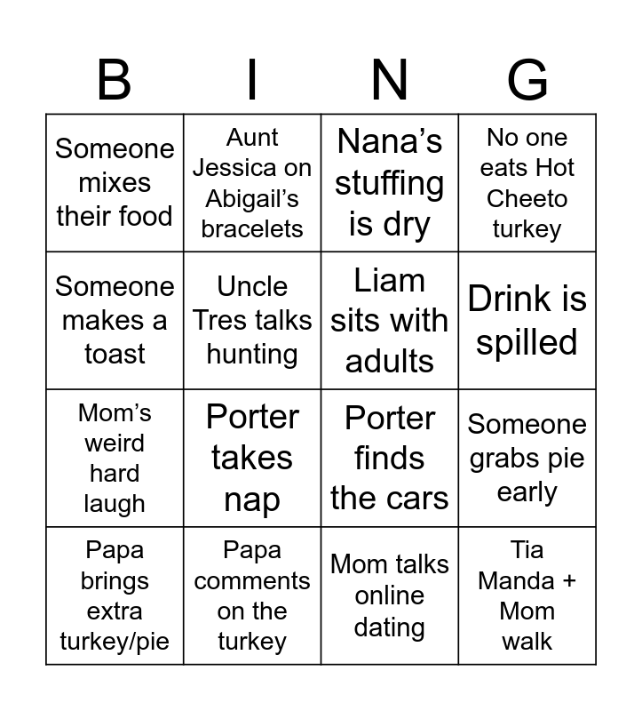 This bingo card has 22 words: Papa comments on the turkey, Papa/Nana mention Liam, Aunt Jessica on Abigail’s bracelets, Aunt Lolo baby voice, Uncle Tres talks hunting, Liam sits with adults, Someone mixes their food, Nana’s stuffing is dry, Porter finds the cars, Tia Manda + Mom walk, Mom’s weird hard laugh, No one eats Hot Cheeto turkey, Someone asks about school, Someone asks what we're stamping, Mom talks online dating, Dad moving out mentioned, Someone grabs pie early, Papa brings extra turkey/pie, Porter takes nap, Someone makes a toast, Drink is spilled and Nana shows quilts.