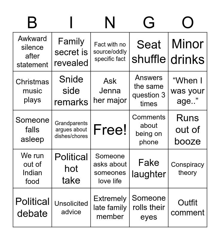 This bingo card has a free space and 24 words: Political hot take, Unsolicited advice, Ask Jenna her major, Political debate, Minor drinks, Awkward silence after statement, Christmas music plays, Family secret is revealed, Comments about being on phone, Someone asks about someones love life, Answers the same question 3 times, Someone falls asleep, Fake laughter, Conspiracy theory, Snide side remarks, Someone rolls their eyes, Runs out of booze, Fact with no source/oddly specific fact, “When I was your age..”, Grandparents argues about dishes/chores, Outfit comment, We run out of Indian food, Seat shuffle and Extremely late family member.