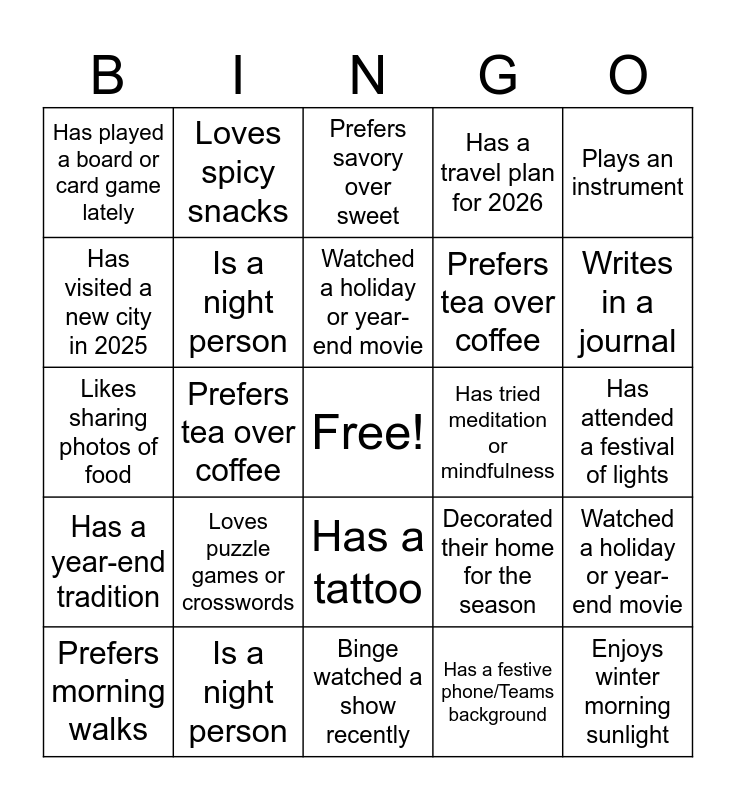 This bingo card has a free space and 135 words: Loves chocolate, Loves spicy snacks, Decorated their home for the season, Has attended a festival of lights, Enjoys a winter playlist, Has a favorite street-food spot, Prefers morning walks, Has tried a new recipe recently, Watched a holiday or year-end movie, Can say ‘thank you’ in another language, Has played a board or card game lately, Shared a handmade gift before, Wears contacts, Has a travel plan for 2026, Enjoys cricket or American football, Has taken a train trip in the past year, Keeps plants at their workspace/home, Uses a reusable mug or water bottle, Has a favorite warm beverage, Enjoys night markets or street fairs, Binge watched a show recently, Prefers sweets over savory, Prefers savory over sweet, Has visited a new city in 2025, Enjoys volunteering or community events, Loves puzzle games or crosswords, Has tried meditation or mindfulness, Keeps a to-do list app or notebook, Enjoys baking or cooking weekends, Has a brother, Has a year-end tradition, Likes sharing photos of food, Has a festive phone/Teams background, Prefers tea over coffee, Prefers coffee over tea, Enjoys tech podcasts, Has a favorite YouTube channel, Has a favorite roadside snack (pakora/tacos etc.), Sings in the shower, Has worn festive colors this season, Enjoys winter morning sunlight, Collects magnets, Has tried a new hobby in 2025, Has a sister, Has met a celebrity, Is a night person, Is a morning person, Can speak more than two languages, Has a tattoo, Wears glasses, Wears contacts, Has met a celebrity, Has been on TV, Watches cooking shows, Has a reusable shopping bag handy, Enjoys the sunset, Enjoys the sunrise, Uses dark mode on phone/computer, Took photos of nature recently, Reads e-books, Listens to audiobooks, Plays an instrument, Practices Meditation, Has taken a selfie with family and friends recently, Was born in a different country from where they currently live, Uses a playlist for focus, Has a motorcycle, Uses public transportation, Loves chocolate, Loves spicy snacks, Decorated their home for the season, Has attended a festival of lights, Enjoys a winter playlist, Has a favorite street-food spot, Prefers morning walks, Has tried a new recipe recently, Watched a holiday or year-end movie, Can say ‘thank you’ in another language, Has played a board or card game lately, Shared a handmade gift before, Wears contacts, Has a travel plan for 2026, Enjoys cricket or American football, Has taken a train trip in the past year, Keeps plants at their workspace/home, Uses a reusable mug or water bottle, Has a favorite warm beverage, Enjoys night markets or street fairs, Binge watched a show recently, Prefers sweets over savory, Prefers savory over sweets, Has visited a new city in 2025, Enjoys volunteering or community events, Loves puzzle games or crosswords, Has tried meditation or mindfulness, Keeps a to-do list app or notebook, Enjoys baking or cooking weekends, Has a brother, Has a year-end tradition, Likes sharing photos of food, Has a festive phone/Teams background, Prefers tea over coffee, Prefers coffee over tea, Enjoys tech podcasts, Has a favorite YouTube channel, Sings in the shower, Has worn festive colors this season, Enjoys winter morning sunlight, Collects magnets, Has tried a new hobby in 2025, Has a sister, Is a night person, Is a morning person, Can speak more than two languages, Has a tattoo, Wears glasses, Has met a celebrity, Has been on TV, Watches cooking shows, Has a reusable shopping bag handy, Enjoys the sunset, Enjoys the sunrise, Uses dark mode on phone/computer, Took photos of nature recently, Reads e-books, Listens to audiobooks, Plays an instrument, Practices Meditation, Has taken a selfie with family and friends recently, Was born in a different country from where they currently live, Uses a playlist for focus, Has a motorcycle, Uses public transportation, Writes in a journal and Has visited a new country in 2025.