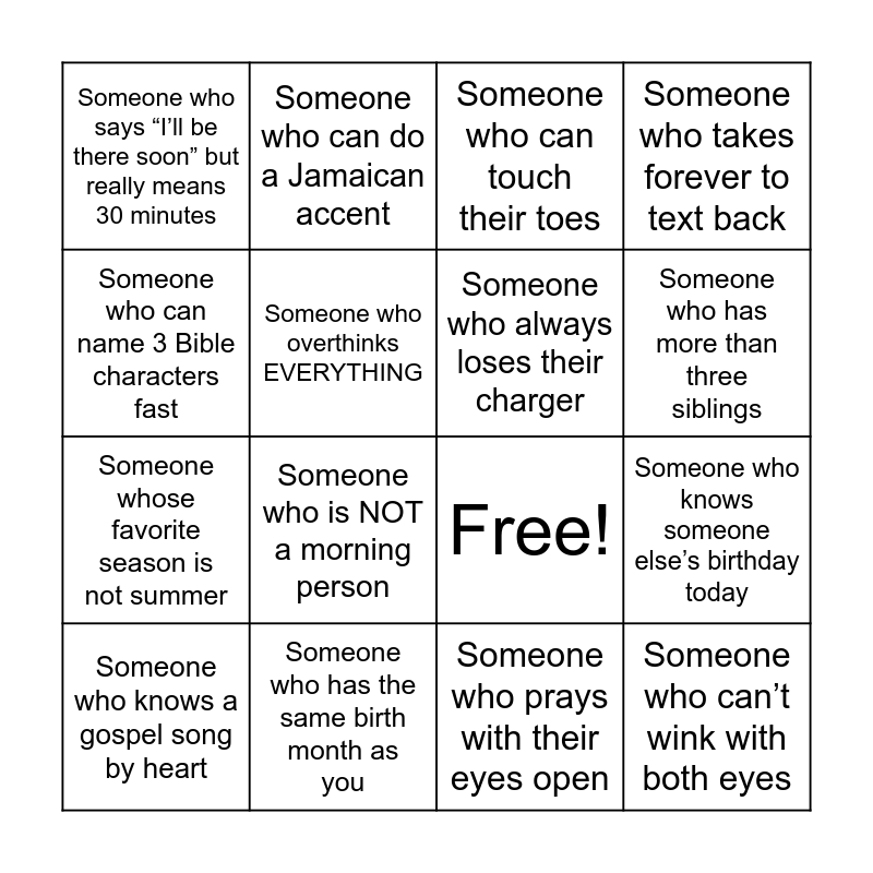 This bingo card has 21 words: Someone who has the same birth month as you, Someone who can name 5 fruits in 5 seconds, Someone who can do a Jamaican accent, Someone who is always early, Someone who prays with their eyes open, Someone who always loses their charger, Someone who says “I’ll be there soon” but really means 30 minutes, Someone who can touch their toes, Free!, Someone who has more than three siblings, Someone whose favorite season is not summer, Someone who takes forever to text back, Someone who can’t wink with both eyes, Someone who sings everything instead of saying it, Someone who overthinks EVERYTHING, Someone who has a serious sweet tooth, Someone who knows a gospel song by heart, Someone who is NOT a morning person, Someone who can name 3 Bible characters fast, Someone who knows someone else’s birthday today and Someone who can name 5 foods starting with the same letter.
