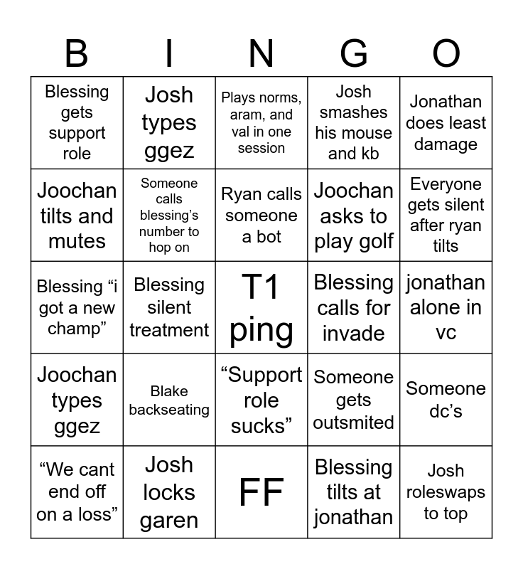 This bingo card has a free space and 24 words: Blake backseating, Josh locks garen, Ryan calls someone a bot, “We cant end off on a loss”, Jonathan does least damage, Blessing gets support role, Joochan tilts and mutes, Josh types ggez, Blessing calls for invade, “Support role sucks”, Joochan asks to play golf, Blessing “i got a new champ”, Someone gets outsmited, Someone dc’s, Someone calls blessing’s number to hop on, Blessing tilts at jonathan, jonathan alone in vc, Plays norms, aram, and val in one session, Everyone gets silent after ryan tilts, Blessing silent treatment, Josh roleswaps to top, Joochan types ggez, Josh smashes his mouse and kb and FF.