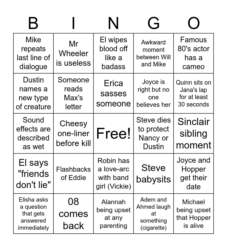This bingo card has a free space and 29 words: Elisha asks a question that gets answered immediately, Hopper smokes a cigarette, Cheesy one-liner before kill, Reference to 'Never ending story/Running up that hill', Mike repeats last line of dialogue, El wipes blood off like a badass, Someone reads Max's letter, Flashbacks of Eddie, Steve dies to protect Nancy or Dustin, 08 comes back, Sinclair sibling moment, Michael being upset that Hopper is alive, Alannah being upset at any parenting, Adem and Ahmed laugh at something (cigarette), Quinn sits on Jana's lap for at least 30 seconds, Tim asks a question about S1-S4 plot, Robin has a love-arc with band girl (Vickie), El says "friends don't lie", Famous 80's actor has a cameo, Sound effects are described as wet, Steve babysits, Will touches his neck and says "He's here", Joyce is right but no one believes her, Dustin names a new type of creature, Awkward moment between Will and Mike, Mr Wheeler is useless, Joyce and Hopper get their date, Erica sasses someone and Serious moment is interrupted by comedic/cringey moment.