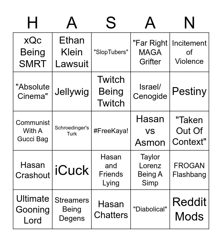 This bingo card has a free space and 24 words: iCuck, Streamers Being Degens, Twitch Being Twitch, Ultimate Gooning Lord, Incitement of Violence, xQc Being SMRT, "Absolute Cinema", Ethan Klein Lawsuit, Hasan vs Asmon, Hasan and Friends Lying, Israel/ Cenogide, Communist With A Gucci Bag, Taylor Lorenz Being A Simp, FROGAN Flashbang, Jellywig, "Diabolical", "Taken Out Of Context", "SlopTubers", Pestiny, Schroedinger's Turk, Reddit Mods, Hasan Crashout, "Far Right MAGA Grifter and Hasan Chatters.