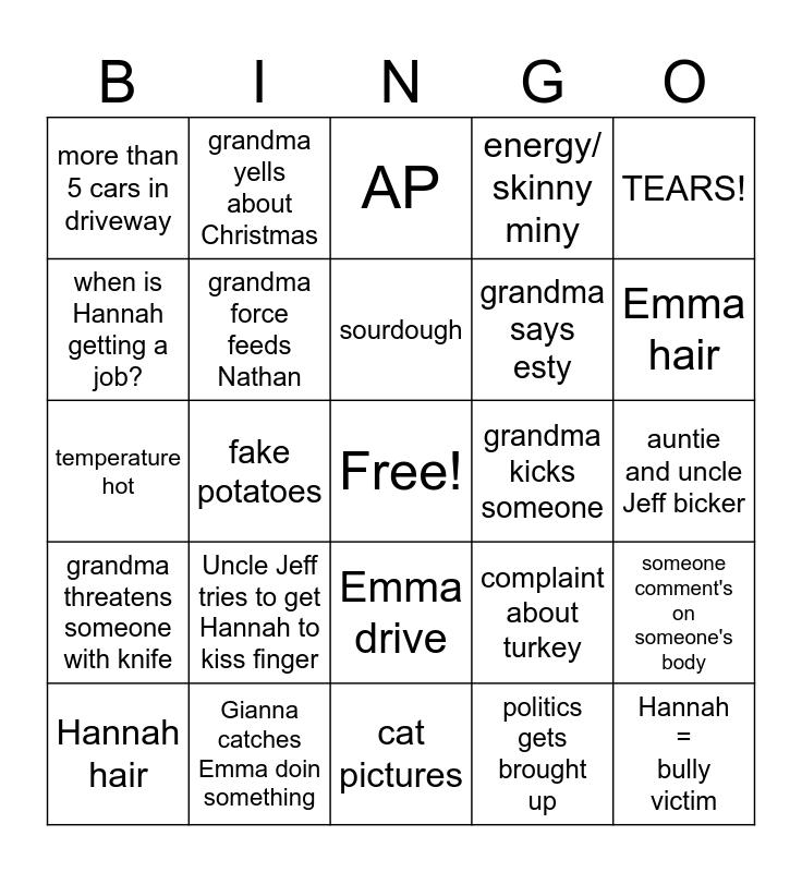 This bingo card has a free space and 24 words: Uncle Jeff tries to get Hannah to kiss finger, Gianna catches Emma doin something, sourdough, Hannah hair, TEARS!, more than 5 cars in driveway, when is Hannah getting a job?, grandma yells about Christmas, grandma kicks someone, Emma drive, grandma says esty, temperature hot, complaint about turkey, someone comment's on someone's body, grandma force feeds Nathan, politics gets brought up, auntie and uncle Jeff bicker, AP, Emma hair, fake potatoes, Hannah = bully victim, grandma threatens someone with knife, energy/ skinny miny and cat pictures.