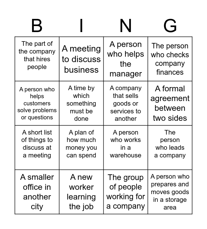 This bingo card has 16 words: A new worker learning the job, The person who leads a company, A person who helps the manager, The part of the company that hires people, A short list of things to discuss at a meeting, A meeting to discuss business, A person who works in a warehouse, The group of people working for a company, A person who helps customers solve problems or questions, A time by which something must be done, A smaller office in another city, The person who checks company finances, A plan of how much money you can spend, A formal agreement between two sides, A company that sells goods or services to another and A person who prepares and moves goods in a storage area.