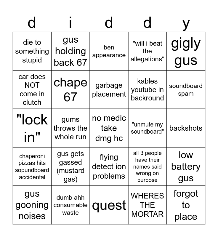 This bingo card has 35 words: void reaver kills us personally, no lead detect, kable 67, chape 67, flying detect ion problems, "will i beat the allegations", car does NOT come in clutch, gus 67, garbage placement, doesnt get past, "lock in", gigly gus, we lose, gums christmas tree, die to something stupid, "unmute my soundboard", WHERES THE MORTAR, gums throws the whole run, chaperoni pizzas hits sopundboard accidental, no medic take dmg hc, all 3 people have their names said wrong on purpose, gus gooning noises, low battery gus, dumb ahh consumable waste, ben appearance, soundboard spam, forgot to place, gums gets kicked, kables youtube in backround, backshots, w avatar (lobby), quest, gus gets gassed (mustard gas), gus holding back 67 and "im bored".