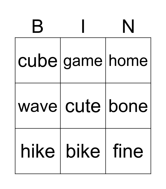 This bingo card has 12 words: lake, fine, cute, bone, game, home, bike, tube, cube, wave, hike and rope.
