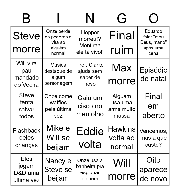 This bingo card has 25 words: Mike e Will se beijam, Onze usa a banheira pra espionar alguém, Prof. Clarke ajuda sem saber de novo, Eles jogam D&D uma última vez, Eduardo fala: "meu Deus, mano" após uma cena, Steve morre, Will vira pau mandado do Vecna, Onze perde os poderes e vira só alguém normal, Alguém usa uma arma muito massa, Eddie volta, Max morre, Steve tenta salvar todos, Hawkins volta ao normal, Vencemos, mas a que custo?, Música destaque de algum personagem, Oito aparece de novo, Final em aberto, Hopper morreu!? Mentiraa ele tá vivo!!, Episódio de natal, Onze come waffles pela última vez, Caiu um cisco no meu olho, Nancy e Steve se beijam, Flashback deles crianças, Final ruim and Will morre.