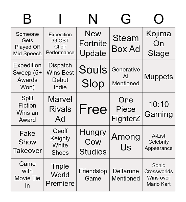 This bingo card has a free space and 24 words: Geoff Keighly White Shoes, Triple World Premiere, Souls Slop, Game with Movie Tie In, Kojima On Stage, Someone Gets Played Off Mid Speech, Expedition Sweep (5+ Awards Won), Expedition 33 OST Choir Performance, One Piece FighterZ, Hungry Cow Studios, Generative AI Mentioned, Split Fiction Wins an Award, Among Us, A-List Celebrity Appearance, Dispatch Wins Best Debut Indie, Deltarune Mentioned, 10:10 Gaming, New Fortnite Update, Muppets, Marvel Rivals Ad, Sonic Crossworlds Wins over Mario Kart, Fake Show Takeover, Steam Box Ad and Friendslop Game.