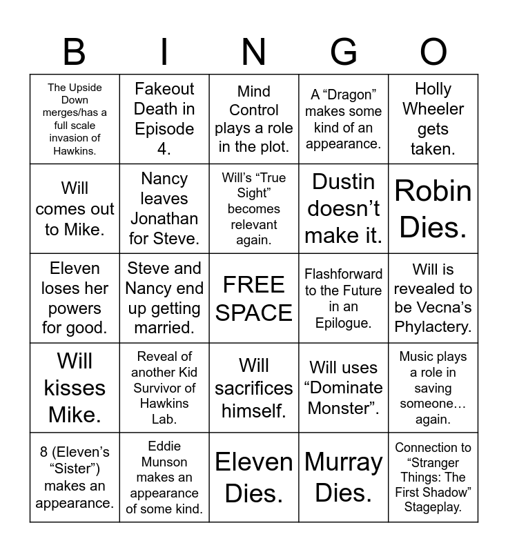 This bingo card has a free space and 24 words: Reveal of another Kid Survivor of Hawkins Lab., Eddie Munson makes an appearance of some kind., Will’s “True Sight” becomes relevant again., 8 (Eleven’s “Sister”) makes an appearance., Holly Wheeler gets taken., The Upside Down merges/has a full scale invasion of Hawkins., Will comes out to Mike., Fakeout Death in Episode 4., Flashforward to the Future in an Epilogue., Will sacrifices himself., Dustin doesn’t make it., Eleven loses her powers for good., Will uses “Dominate Monster”., Music plays a role in saving someone…again., Nancy leaves Jonathan for Steve., Murray Dies., Will is revealed to be Vecna’s Phylactery., Mind Control plays a role in the plot., Robin Dies., Steve and Nancy end up getting married., Connection to “Stranger Things: The First Shadow” Stageplay., Will kisses Mike., A “Dragon” makes some kind of an appearance. and Eleven Dies..
