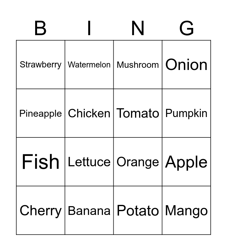 This bingo card has 16 words: Banana, Apple, Mushroom, Strawberry, Fish, Watermelon, Orange, Potato, Pineapple, Chicken, Cherry, Onion, Lettuce, Pumpkin, Tomato and Mango.